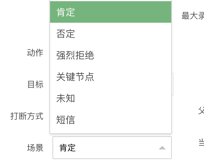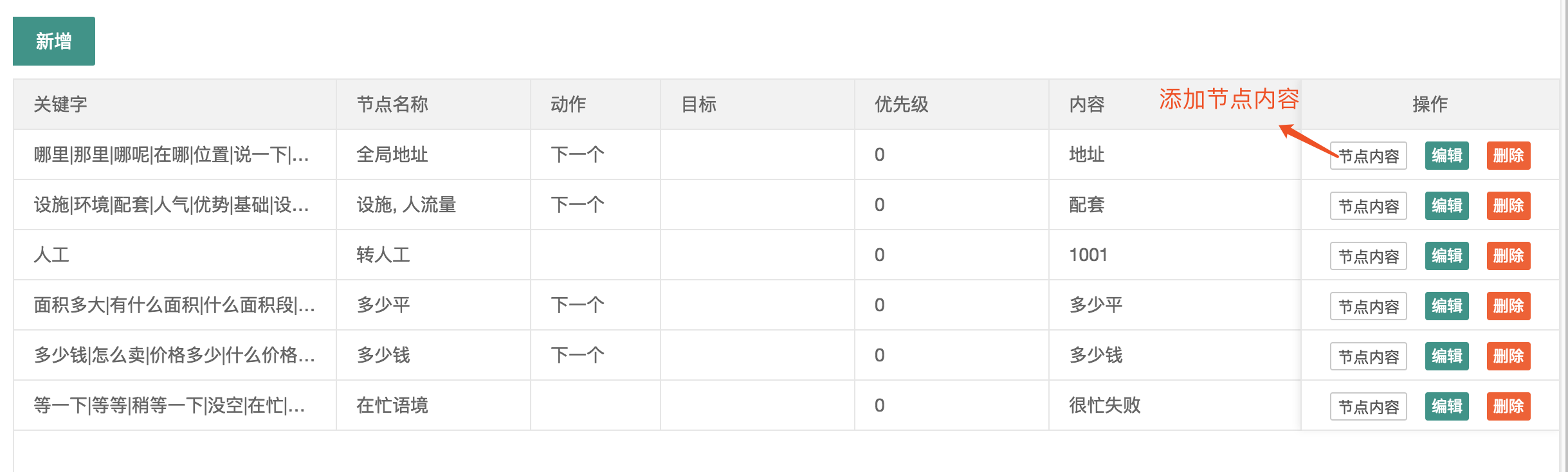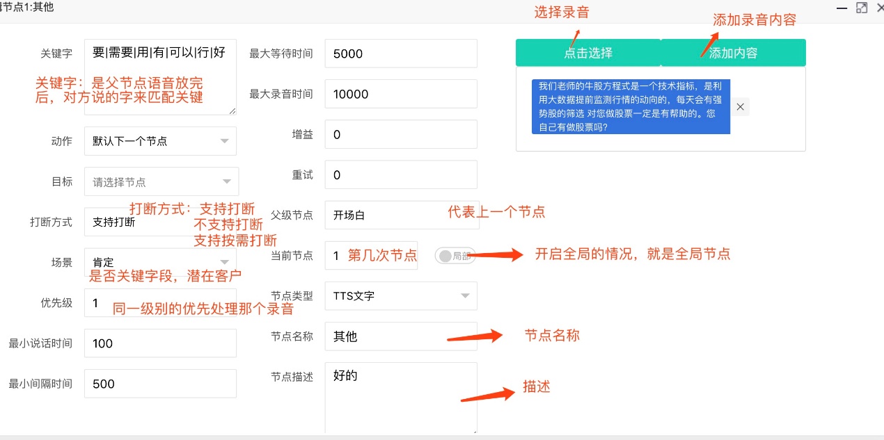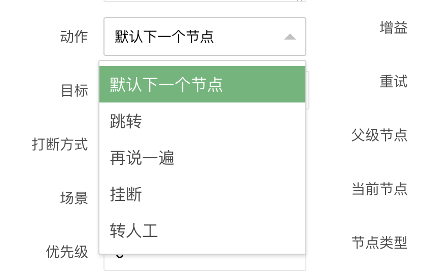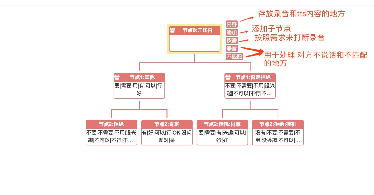 默认下一个节点:去找字节点关键字播放录音; 跳转:跳转到某一个节点,不播放当前节点录音,播放跳转到的那个节点录音; 再说一遍:重复说一遍父节点; 挂断:播放完当前节点录音,就挂断; 转人工:转人工坐席