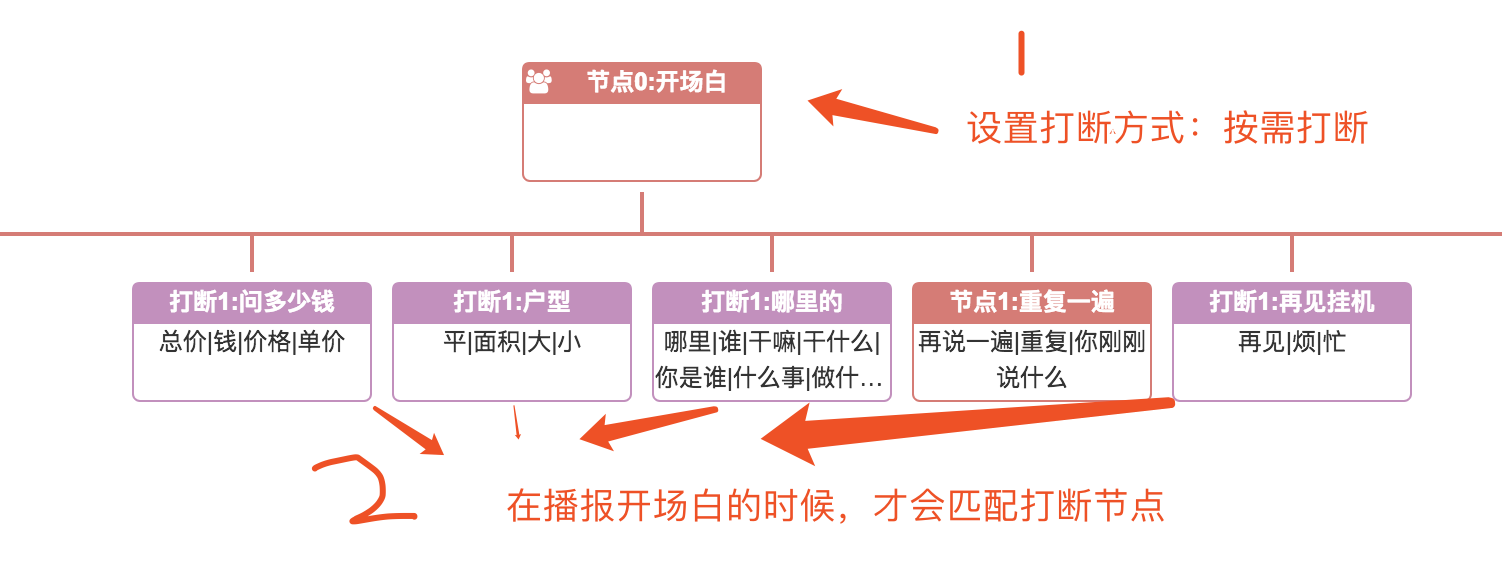 按需打断就是,在父节点播报录音的时候,你去打断的关键字。如果没有匹配到按需打断的关键字择继续播报语音不被打断。